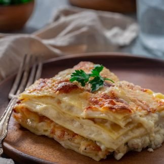 opgestapeld deeg met gehakt, tomaten en gorgonzolakaas,