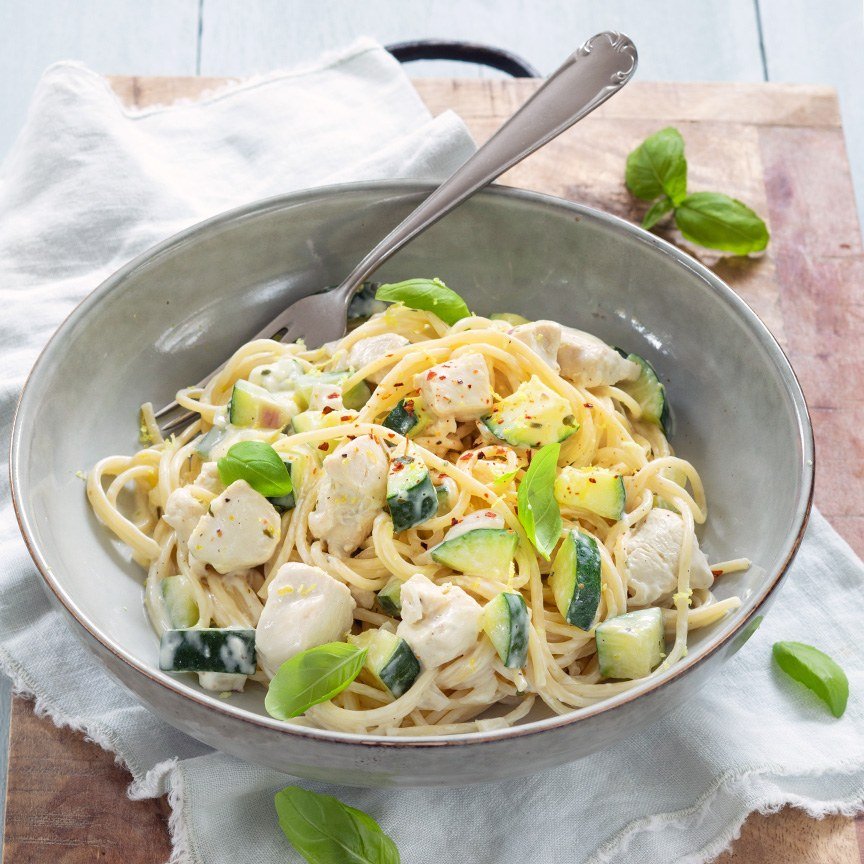 champignons, roomsaus, en kip